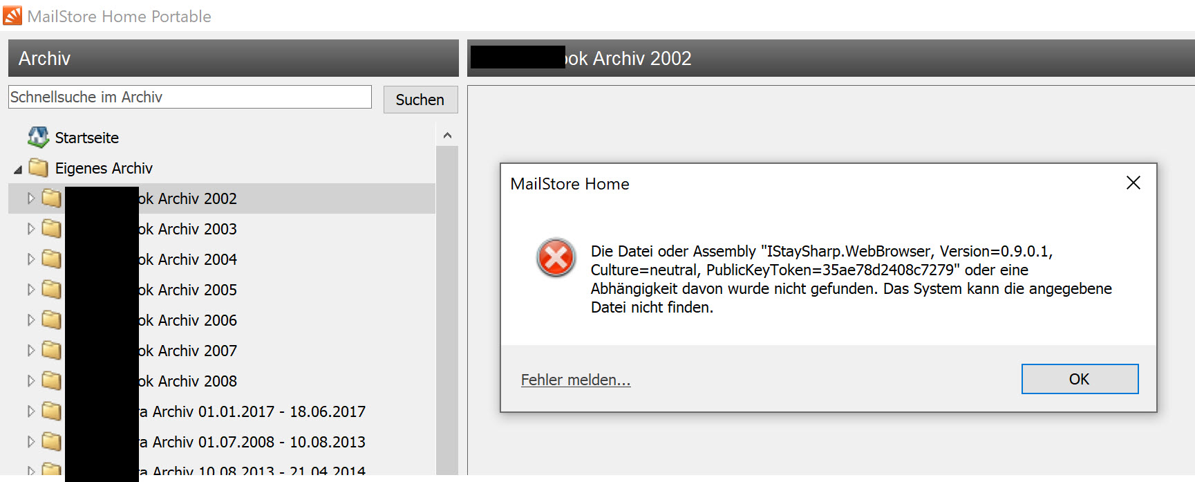 Was passiert denn, wenn du eine weitere, neue Installation als portable Version in ein neues Verzeichnis durchführst. Startet dann Mailstore ohne Fehlermeldung? Das Archiv ist dann natürlich leer, aber die Datenübernahme ist kein Problem, erkläre ich dann.